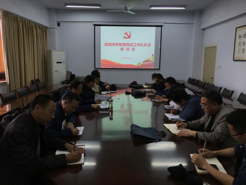 2019年5月16日上午,在办公楼四楼会议室召开陇南师专新增帮扶工作队队员培训会,党委委员、副校长王录全同志主持会议,派出单位负责人参加了会议。