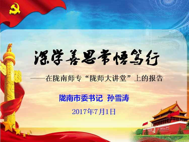 7月1日上午,市委书记孙雪涛以“深学善思常悟笃行”为题在我校“陇师大讲堂”为300多名教师党员和学生党员代表讲党课,两个多小时深入浅出的讲解,赢得了师生们的阵阵掌声。学校党委书记司跃宁主持党课报告会。