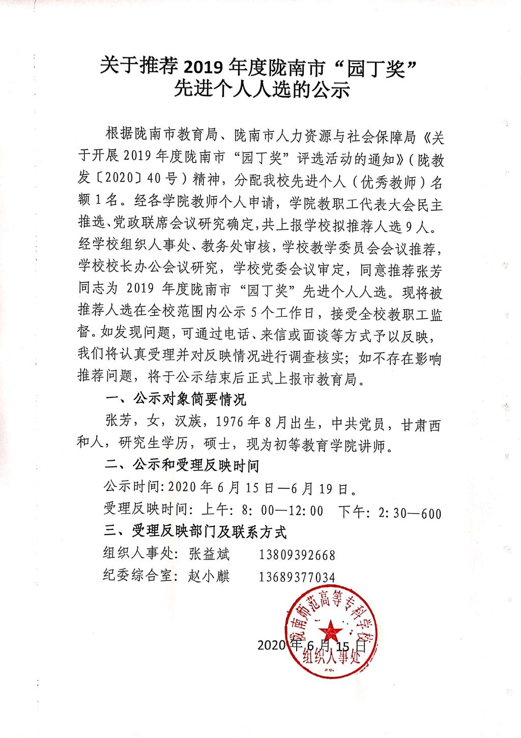 关于推荐2019年度陇南市“园丁奖”先进个人人选的公示