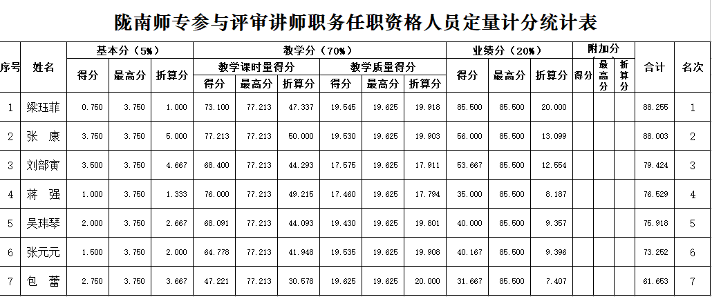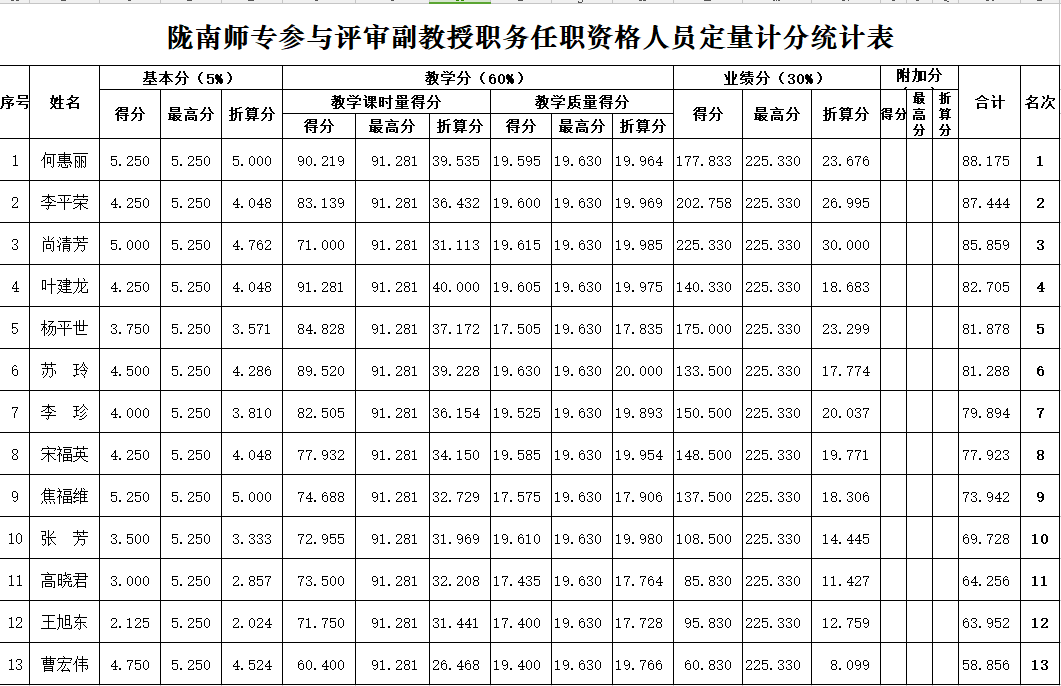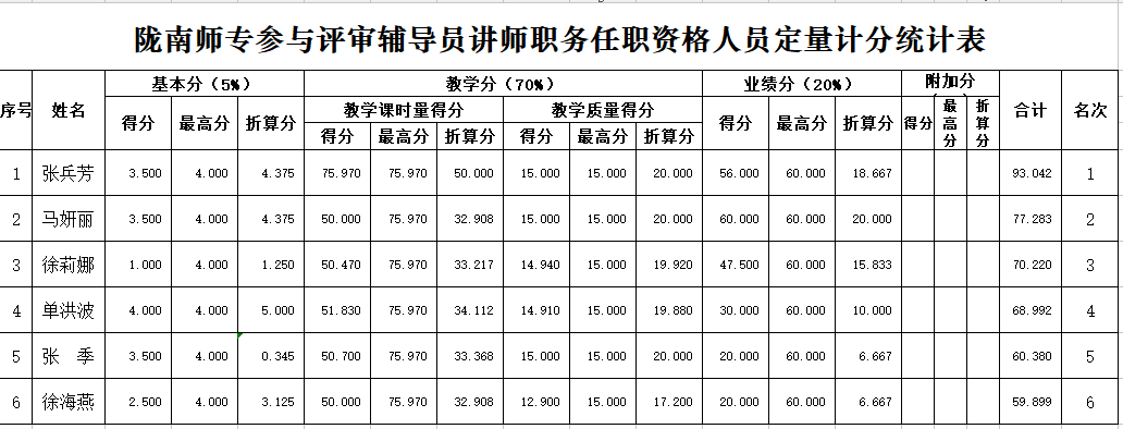 陇南师专参与评审副教授讲师职务任职资格人员定量计分统计表