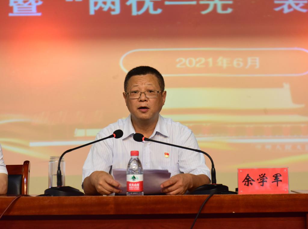 余学军作了讲话。他代表学校党委,向全校各级党组织和奋斗在各自战线的党员同志们,向为学校建设发展做出重要贡献的离退休老党员、老同志致以节日的问候!向受到表彰的先进集体和先进个人表示热烈的祝贺!他指出,一百年来,中国共产党始终站在时代发展的潮头,始终引领社会前进方向,始终保持顽强的斗志和坚强的生命力,带领全国各族人民,迈过一道又一道沟坎,取得一个又一个伟大的胜利,谱写了中华民族从站起来、富起来到强起来的历史篇章。我校是一所具有革命传统和红色基因的学校,早在建校之初就有卜宪基等人在学校传播革命思想,涌现出了奔赴延安革命圣地的邓品珊、叶滨以及为解放成县牺牲的中共成县临时工委书记茹素等一大批优秀学子。中华人民共和国成立后,学校在中国共产党的领导下办学水平和规模不断提升,实现了由中等专科学校向高等学校的跨越式发展,特别是党的十八大以来,学校党委以习近平新时代中国特色社会主义思想为指导,团结带领全校党员干部,坚持“围绕发展抓党建,抓好党建促发展”的工作思路,把内涵建设、深化改革作为发展主线,有力推进了学校各项事业的高质量发展。他强调,面对新时代高等教育发展的新形势,我们必须从全局和战略高度充分认识加强和改进党建工作的重要性和紧迫性,着力推进工作创新,全面增强全校各级党组织和党员干部队伍的凝聚力、战斗力和创造力,再谋划、再部署、再出征,坚定攻坚克难的信心、坚定改革创新的决心,为加快学校建设与发展提供坚强的政治保证。他对全校各级党组织和党员干部提出了三点要求:第一,旗帜鲜明讲政治,绝对忠诚不动摇。作为党员同志,必须充分认识讲政治的重大意义,站稳政治立场,自觉在思想上政治上行动上同以习近平同志为核心的党中央保持高度一致,以高度的责任感和强烈的事业心,主动作为、积极作为,敢于担当、乐于奉献;第二,勠力同心成合力,升本目标不动摇。坚持党的正确领导,坚定信心,全面加强学校党建引领工作,将党的全面领导融入到学校治理各环节,渗透到基层一线,充分发挥好党员先锋模范作用,共同凝聚成学校改革发展的强大合力;第三,加强学习不忘本,高质量发展不动摇。要坚持学习、不忘初心、牢记使命,做到“学史明理、学史增信、学史崇德、学史力行”,献礼建党100周年,围绕立德树人根本任务,以落实高校党建工作重点任务为抓手,全面加强党的建设,推动学校向高质量发展迈进。
