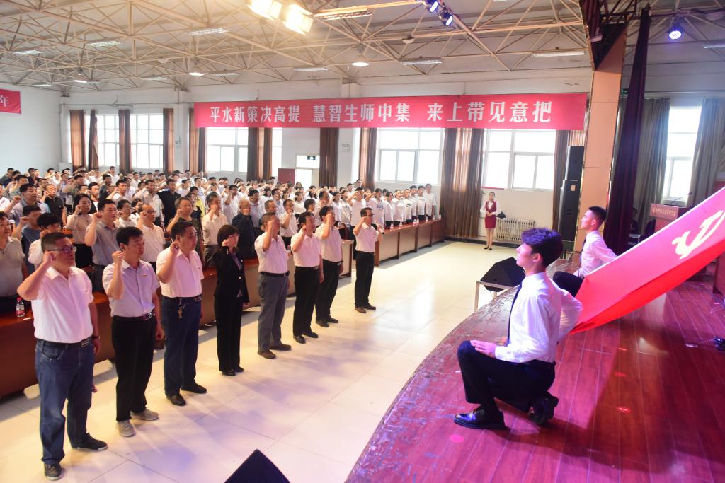 张建辉领誓,全体与会党员面向鲜艳的党旗重温入党誓词。