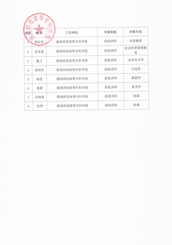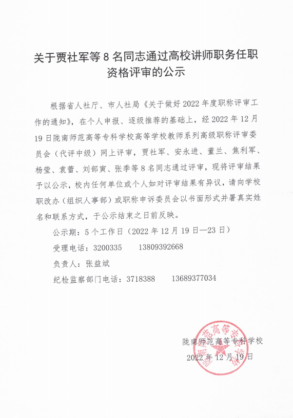 关于贾社军等8名同志通过高校讲师职务任职资格评审的公示